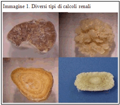 Esistono numerosi tipi di calcoli renali (ossalato di calcio, fosfato di calcio, acido urico, struvite, etc), e ciascun tipo è generato dall’azione contemporanea di numerosi fattori (elettroliti urinari, pH urinario, dieta, farmaci, patologie renali, patologie metaboliche, etc). Questi elementi portano in ultima istanza alla formazione di un nucleo calcifico alla cui periferia si depongono cristalli di varia natura (immagine 1), esattamente come accade per il calcare sui lavandini. Una volta formatosi nel rene, il calcolo può migrare all’interno dell’uretere, uno stretto condotto che trasporta l’urina dal rene alla vescica, e quindi determinare l’ostruzione di tale condotto generando la famosa “colica”. E’ chiaro dunque che intervenendo sul primum movens della formazione del calcolo, ovvero su tutte quelle condizioni che portano alla nucleazione e cristallizzazione del calcolo, è possibile ridurre il rischio di sviluppare ulteriori coliche e rimare così “stone free”.